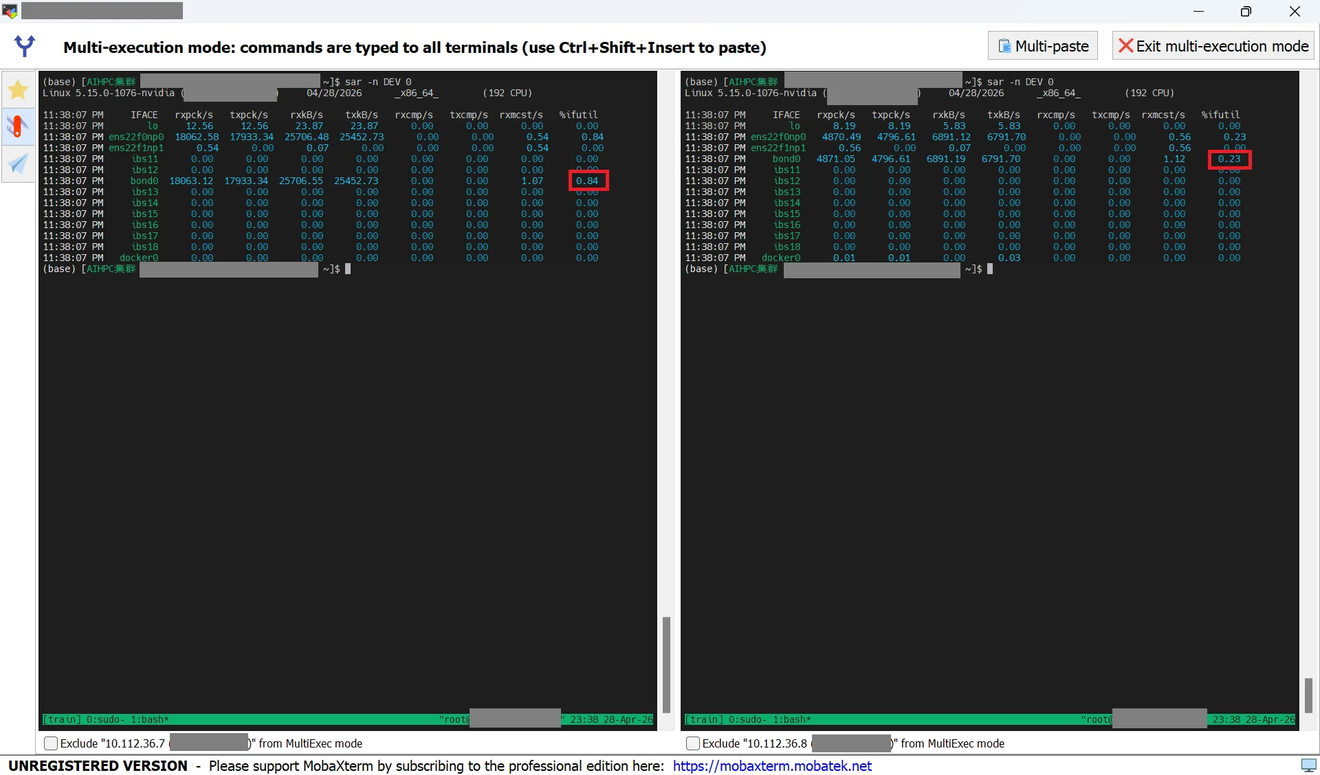 使用指令 sar -n DEV 1 查看网络设备占用情况,果真如此,25Gbps 以太网卡都跑到满载了(下图网卡为空载,仅为示例,当时训练时显示 80% 多)。