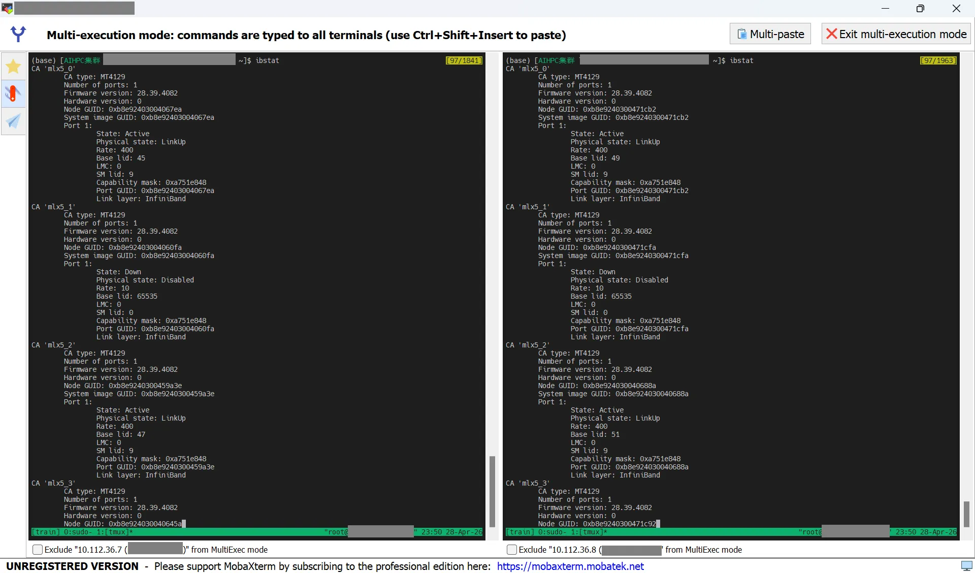 另外我发现,机上实际上是有 400Gbps 的 InfiniBand 高速网卡的,使用 ibstat 指令可以查看当前机器的 InfiniBand 网卡情况,发现有八个 mlx5_* 开头的 400Gbps 端口。